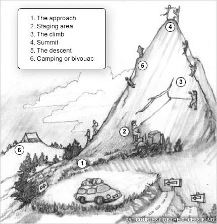 Climbing has an impact on the plants and soils at the bottom and top of a climb, as well as on cliff-dwelling plants. The access fund identifies 6 zones impacted by a typical climb (see illustration below). Please minimize your impact on vegetation at all times but be aware of site-specific issues as well.